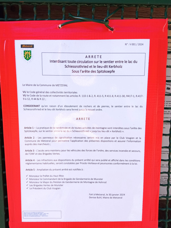 En raison des derniéres chutent de rochers sur la paroi des Spitzkoepfe le 29 janvier 2024 (à l'origine dun dramatique accident provoquant le décès d'un membre du PGM de Munster), par arrété,